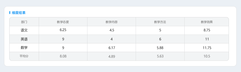 使用問卷星360度教學(xué)評估工具。以年級為單位創(chuàng)建360度評估問卷,設(shè)置好相應(yīng)的維度評估要點(例如教學(xué)態(tài)度、教學(xué)內(nèi)容、教學(xué)方法等),通過對這些通用維度的評估可以從多個方面了解每個老師的教學(xué)情況。不僅如此,問卷星還支持根據(jù)教學(xué)科目給老師分組,按分組結(jié)果查看每個教學(xué)科目的評估結(jié)果,從而了解學(xué)生對每個學(xué)科科目的喜愛程度。同時,問卷星360度評估使用的是一對多批量進(jìn)行評估,相對傳統(tǒng)的一對一評估模式可大量節(jié)省答題者的作答時間。